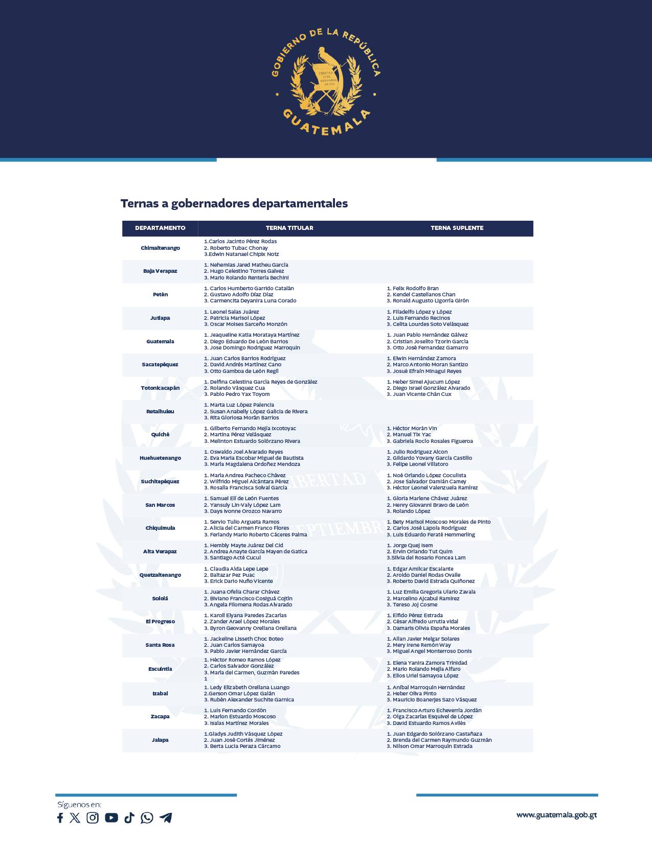 Con respecto al proceso de designación de gobernadores departamentales, el Gobierno de Guatemala informa:
