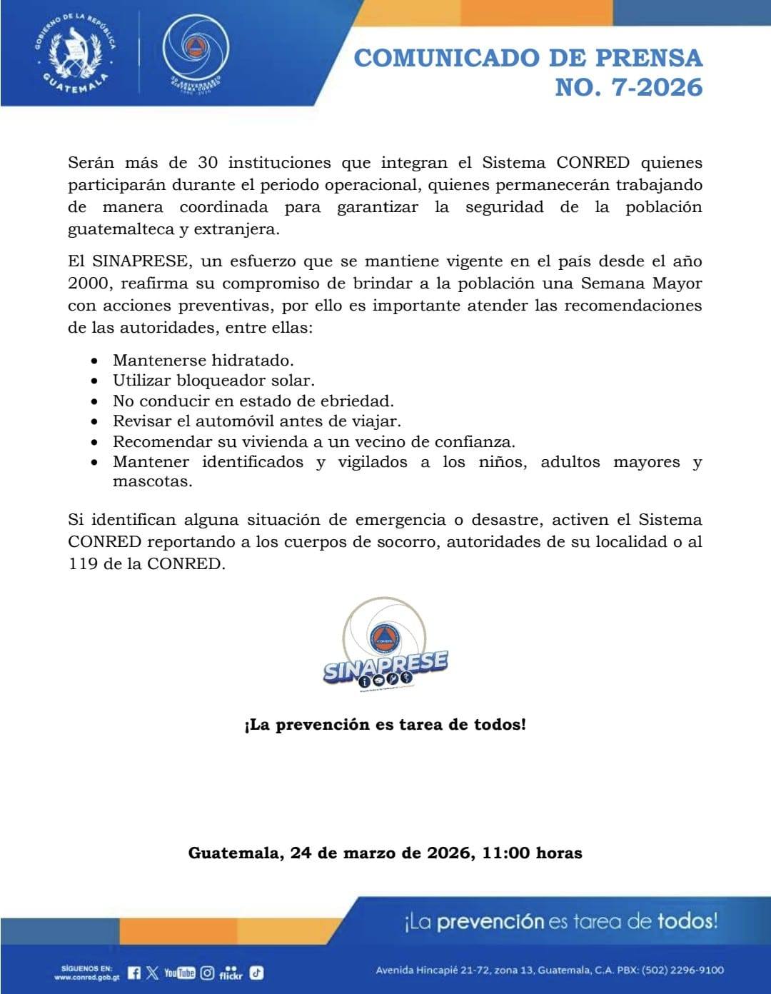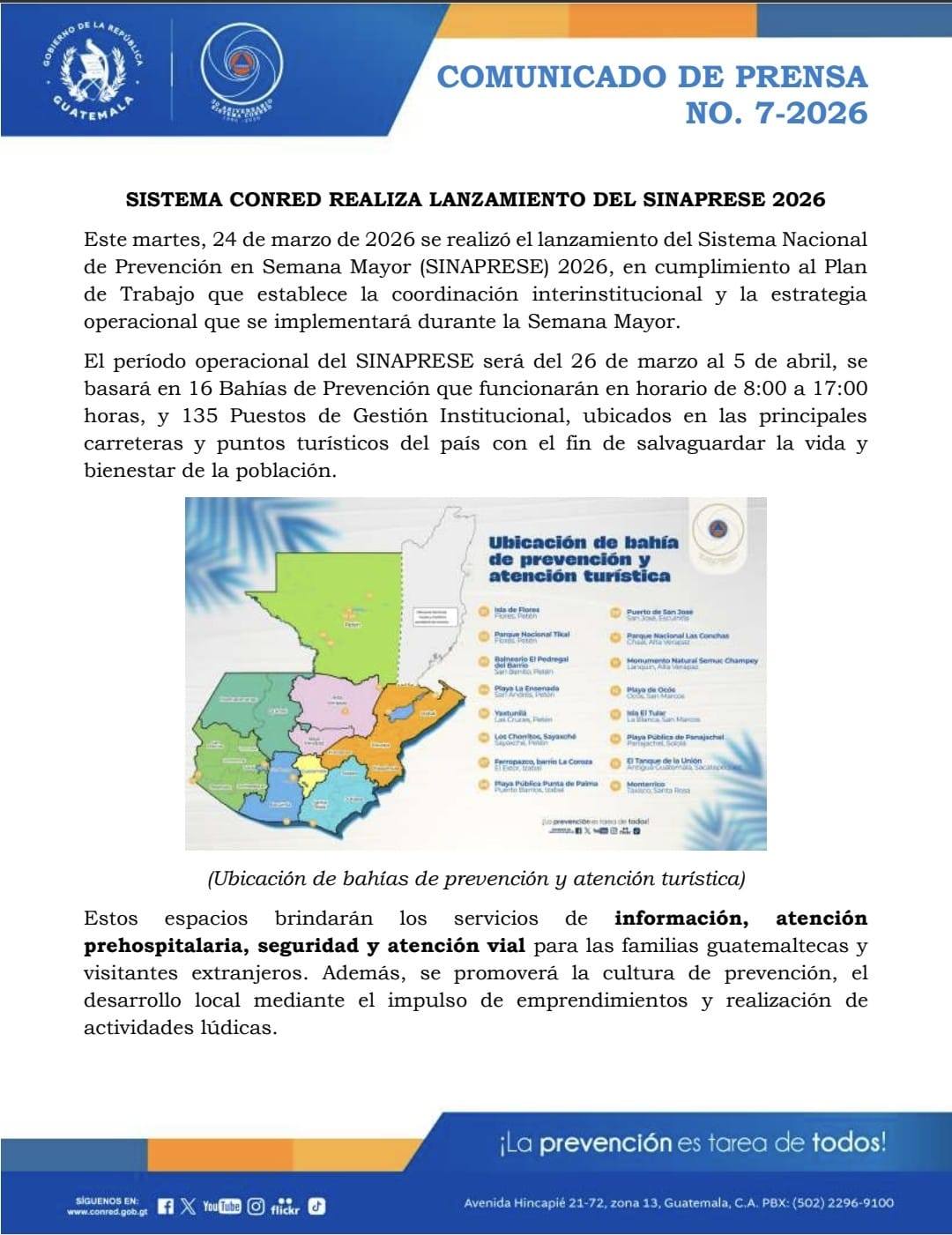 El Sistema de la Coordinadora Nacional para la Reducción de Desastres anunció el lanzamiento del Sistema Nacional de Prevención en Semana Mayor (SINAPRESE) 2026, como parte de las acciones para resguardar a la población durante el descanso de Semana Santa.
